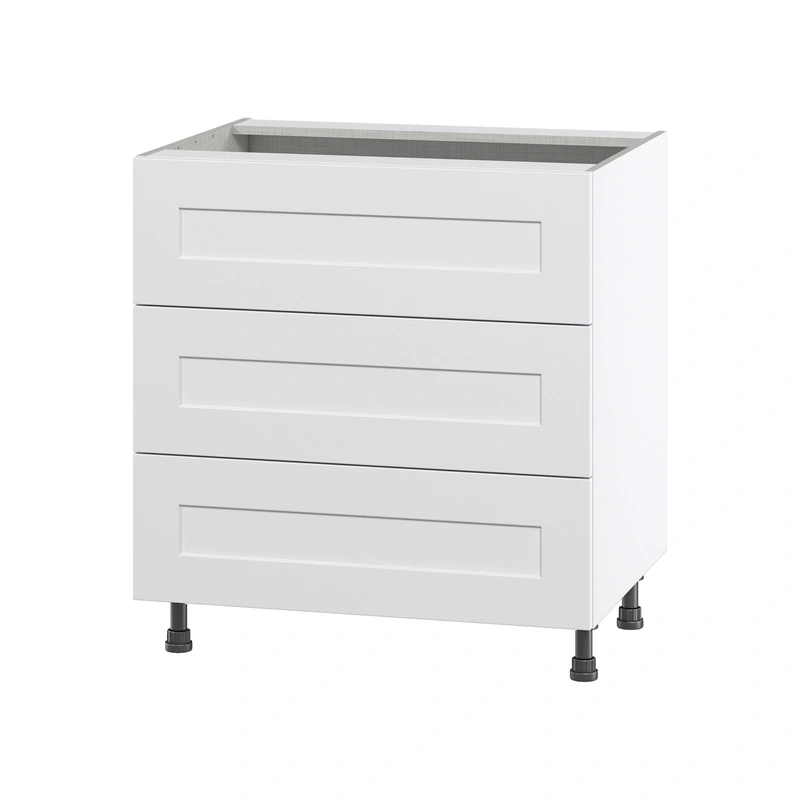 Warm White 3-Drawer Base Cabinet The Hugo&Borg Jolie Base Cabinet offers a sleek, fully assembled storage solution with its warm white finish and modern design. This 3-drawer cabinet combines superior craftsmanship with functionality, featuring full-ex