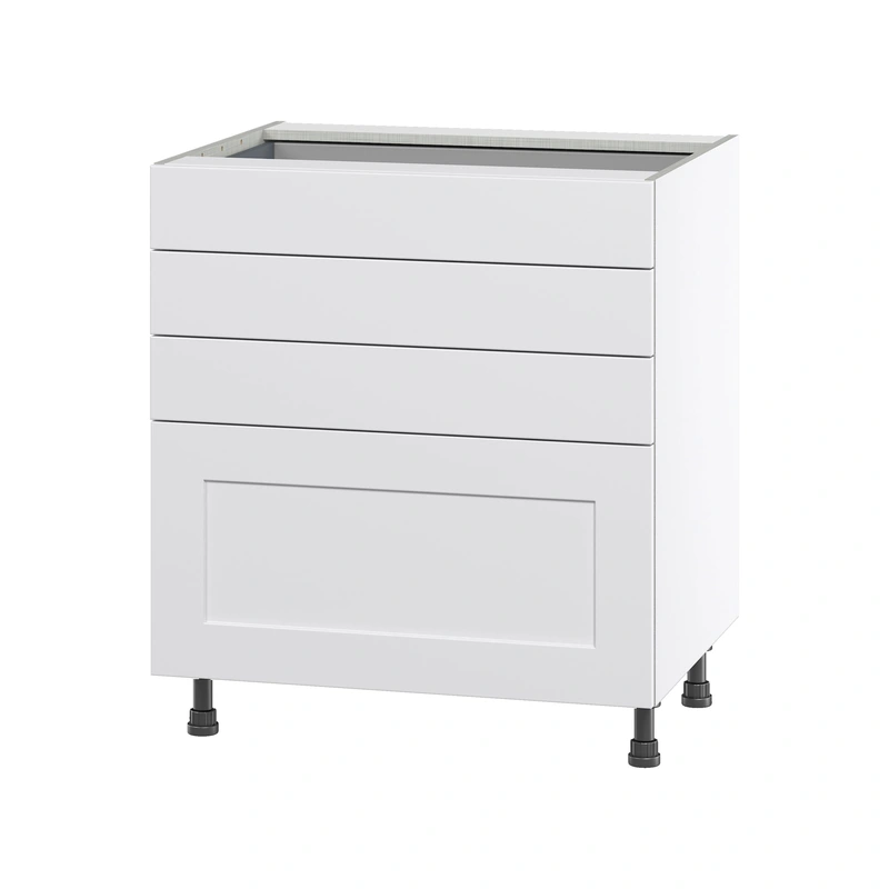 Jolie 30" Fully Assembled 4-Drawer Base Cabinet Transform your space with the Jolie 30" Fully Assembled 4-Drawer Base Cabinet in Warm White. This European-style frameless masterpiece offers up to 20% more storage and features full-extension, soft-close met
