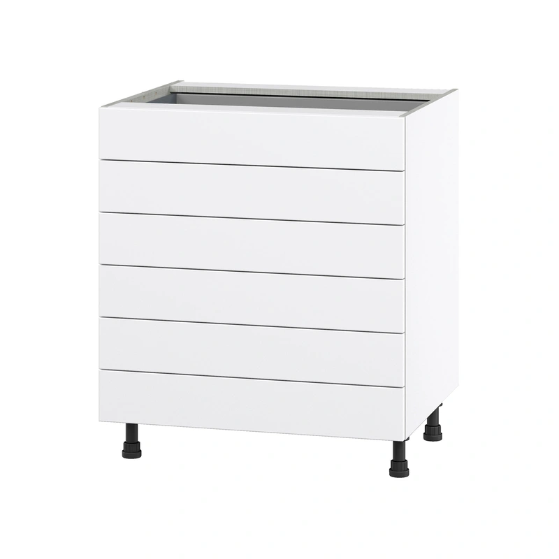 Hugo&Borg Jolie 6-Drawer Warm White Cabinet The Hugo&Borg Jolie 6-Drawer Base Cabinet offers impressive storage and elegance with its warm white finish and modern linen pattern interior. Designed with full extension soft-close drawers and a sturdy