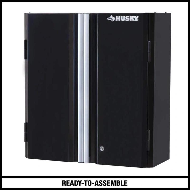 Husky Black Steel Wall-Mounted Garage Cabinet The Husky Black Steel Wall-Mounted Garage Cabinet offers a sleek and highly functional storage solution for garages and workspaces. Made from 24-gauge steel and featuring a powder-coated finish, this cabinet is