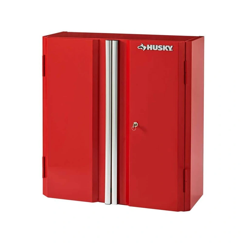 Husky Red Steel Wall Mounted Garage Cabinet Elevate your garage organization with the Husky Red Steel Wall Mounted Garage Cabinet. Built from robust 24-gauge steel, this ready-to-assemble solution includes three adjustable shelves and lockable doors with i