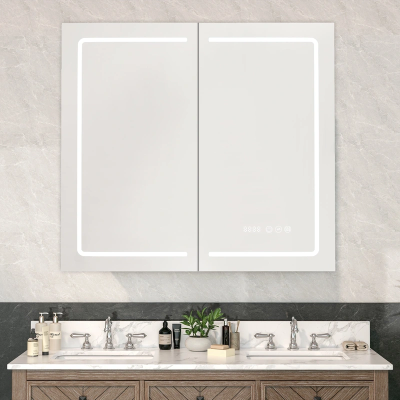 Infuse your space with sophistication through the interplay of light and reflection with the JEAREY 32-in x 27-in Medicine Cabinet. This elegantly mirrored piece not only stores your essentials but transforms your bathroom into a sanctuary of illumination and clarity. The seamless fog-free mirror is a testament to exquisite craftsmanship, while the thoughtful LED configuration offers effortless elegance. Style this cabinet as a chic focal point, breathing an aura of modern refinement into any bathroom setting, and elevate everyday routines into luxurious rituals.