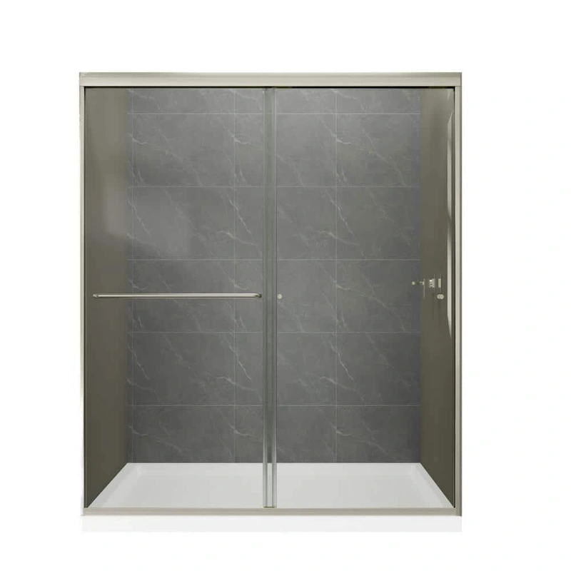 60x70 Pivot Shower Door with Tempered Glass Elevate your bathroom's style and functionality with the JimsMaison 60x70 Pivot Semi-Frameless Shower Door. Its brushed nickel finish and clear tempered glass create an elegant, modern look. Designed with a soft-