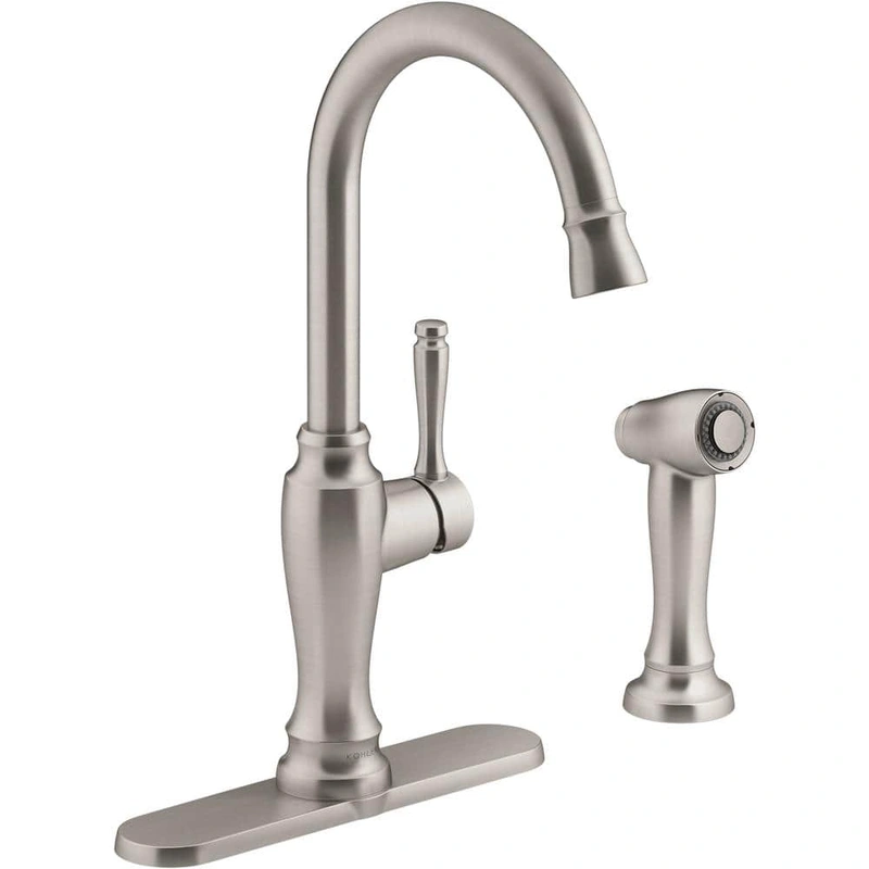 KOHLER Arsdale Single-Handle Kitchen Faucet Upgrade your kitchen with the KOHLER Arsdale Single-Handle Kitchen Faucet, featuring a sleek, high-arch swing spout and versatile sidespray in Vibrant Stainless finish. Designed for both function and reliability,