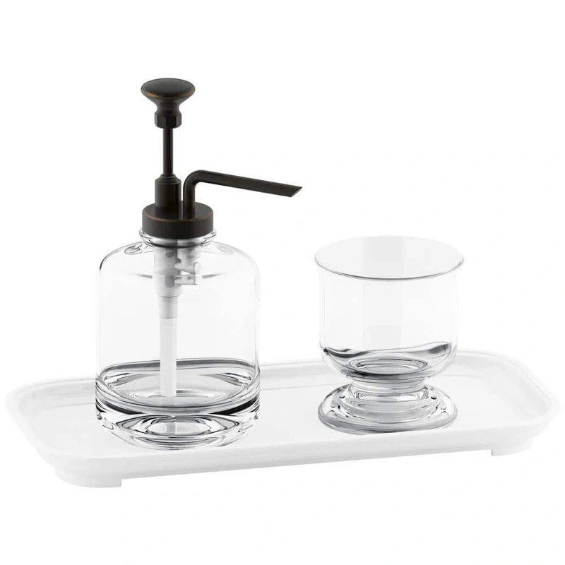 Oil-Rubbed Bronze Artifacts Finishing Ensemble Elevate your bathroom aesthetics with the KOHLER Artifacts Finishing Ensemble. This elegant set, featuring a timeless oil-rubbed bronze finish, includes a glass soap dispenser, tumbler, and ceramic tray, craft