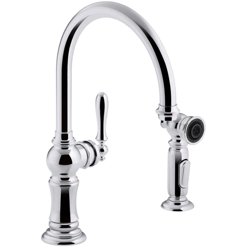 The KOHLER Artifacts Single-Handle Kitchen Faucet combines timeless design with modern functionality. With its high-arch swing spout and multifunctional side sprayer, it offers vintage elegance and practicality. Made with durable brass and featuring a polished chrome finish, this faucet is a blend of classic style and contemporary ease.