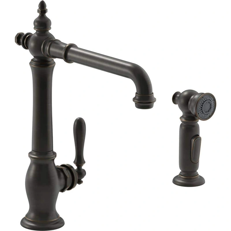 Transform your kitchen with the KOHLER Artifacts Single-Handle Kitchen Faucet, featuring an elegant Victorian-inspired design and durable oil-rubbed bronze finish. Ideal for both traditional and modern kitchens, its swing spout and versatile sidespray make every task easier and more precise.
