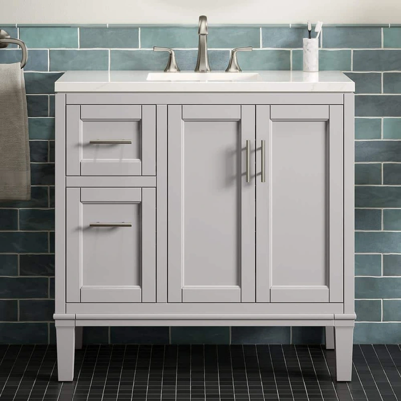 KOHLER Chesil 36" Grey Bath Vanity with Quartz Top The KOHLER Chesil 36" Single Sink Freestanding Vanity brings midcentury modern flair to your bathroom with its sleek design and functional elegance. Featuring a durable Bianco Bella quartz top and an Atmos