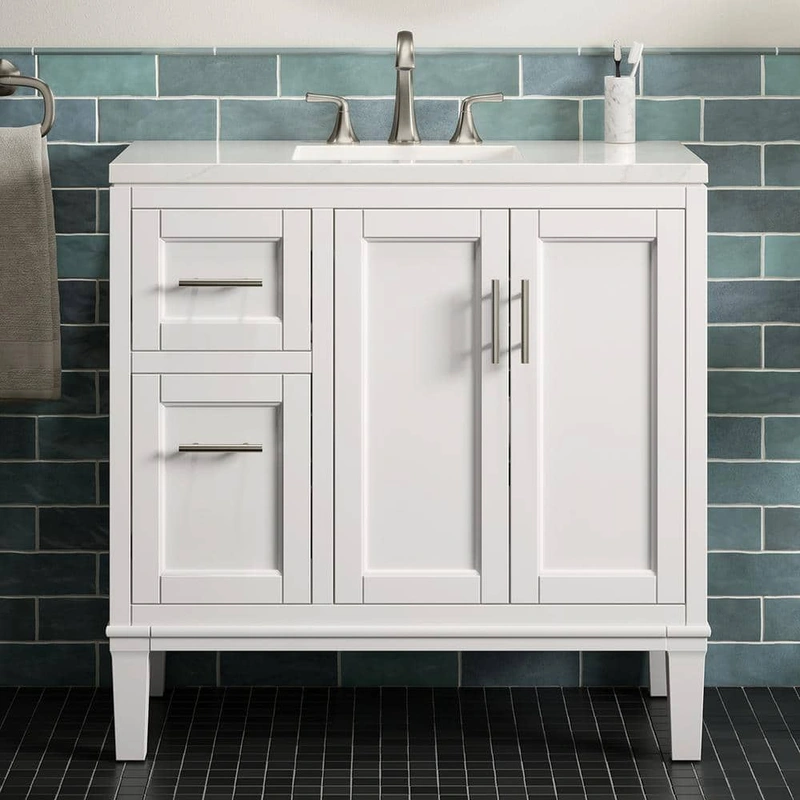The KOHLER Chesil 36-inch Bath Vanity seamlessly blends midcentury modern charm with contemporary functionality. Complete with a Bianco Bella quartz countertop, this vanity set is designed to elevate your bathroom’s aesthetic while offering ample storage and durability. Enjoy the elegance of minimalist design with charming details and robust practicality.