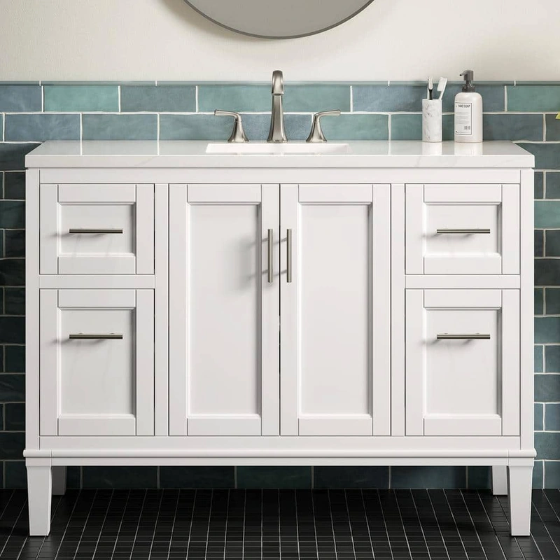 A: With its 48-inch width, this vanity is ideal for medium to large bathrooms, offering both style and functionality.