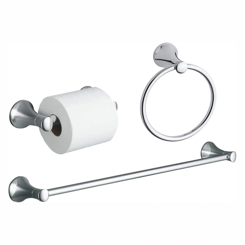 KOHLER Coralais Bathroom Hardware Set - Polished Chrome Elevate your bathroom's aesthetic with the KOHLER Coralais 3-Piece Hardware Bundle, designed in a polished chrome finish. This set includes a 24-inch towel bar, towel ring, and toilet paper holder, al