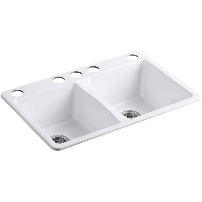 KOHLER Deerfield 33" Cast Iron Kitchen Sink The KOHLER Deerfield 33" Cast Iron Kitchen Sink brings timeless elegance and unmatched functionality to your culinary workspace. Engineered with deep, double-equal bowls, this sink offers expanded space for clean