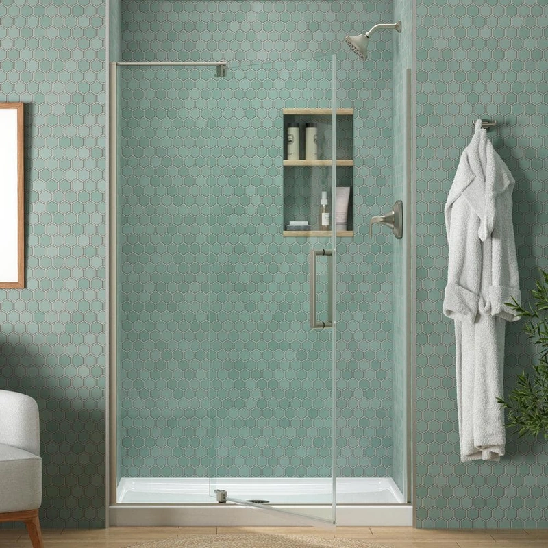 The KOHLER Echelon Frameless Pivot Shower Door transforms your bathroom with its ethereal glass panel and sleek, brushed nickel flourish. This door acts as a modern sculpture, floating effortlessly while maximizing light and transparency. Embrace a seamless open look by pairing it with soft white tiles or contrast its crystalline clarity against bold, dark marble. This shower door is the epitome of refined luxury that elevates any contemporary bath into a serene escape.