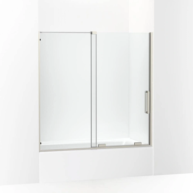 Kohler Echelon Sliding Frameless Tub Door Enhance your bathroom with the Kohler Echelon Sliding Frameless Tub Door in Anodized Brushed Nickel. Featuring a sleek, minimalist design and a robust bottom roller system, this door delivers smooth, quiet operatio