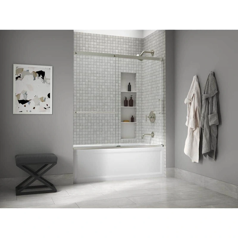 Transform any bathroom into a serene haven with the KOHLER Elate Sliding Frameless Tub Door. Its minimalist silhouette, accentuated by clear glass and nickel accents, introduces an air of contemporary luxury. Picture it flanking a meticulously tiled bath, resonating with refined simplicity and grace. A must-have for those who crave an effortlessly chic abode.