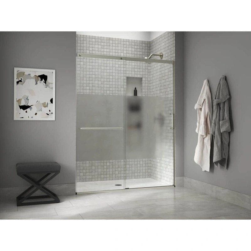 KOHLER Elate Frameless Shower Door Transform your bathroom with the KOHLER Elate Tall Sliding Frameless Shower Door in Anodized Matte Nickel featuring crystal clear glass. Its minimalist design and oversized rollers offer a smooth sliding experience, while