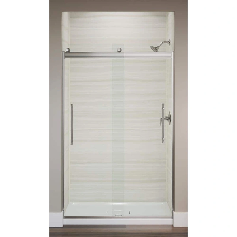 KOHLER Elmbrook Frameless Sliding Shower Door Upgrade your bathroom with the KOHLER Elmbrook Frameless Sliding Shower Door, featuring a sleek anodized brushed nickel hardware and crystal clear glass. Designed for a smooth, quiet sliding action, this shower