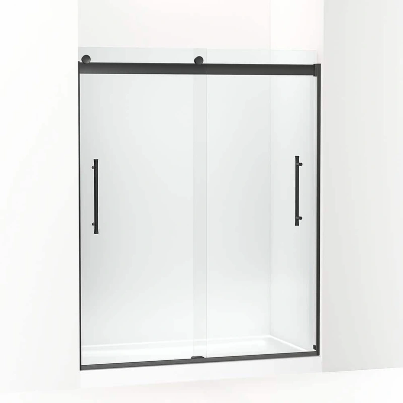 KOHLER Elmbrook Sliding Frameless Shower Door Transform your bathroom with the KOHLER Elmbrook Sliding Frameless Shower Door, featuring a contemporary matte black finish and crystal-clear glass. Its innovative bypass system ensures smooth, quiet sliding, a