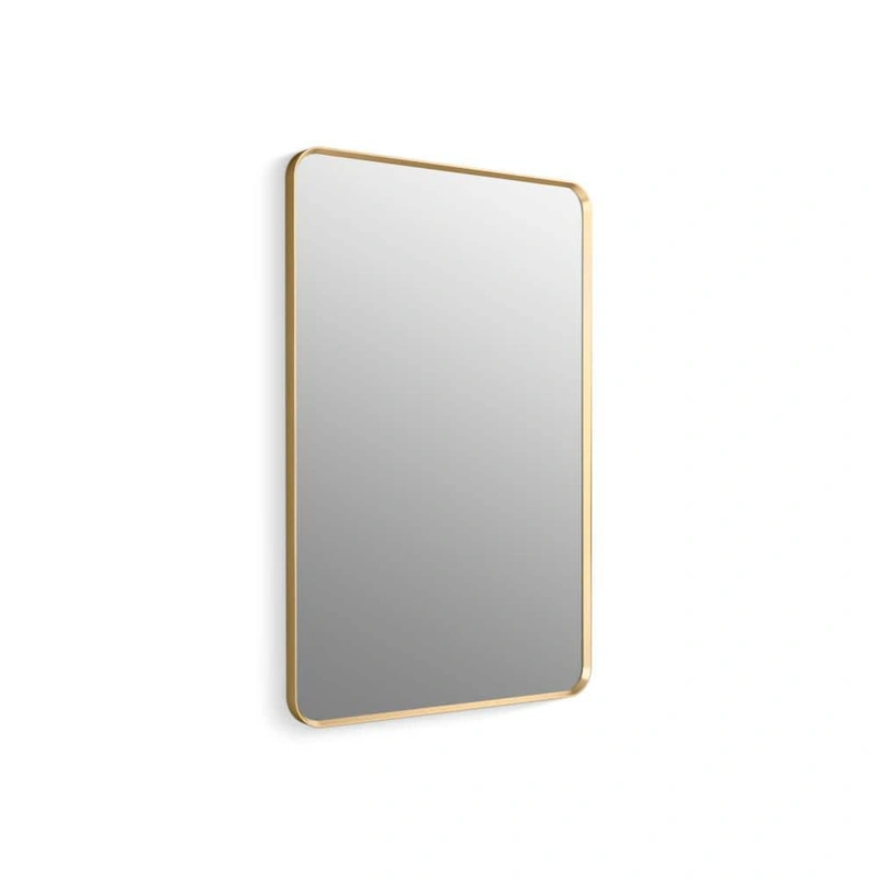 KOHLER Essential Moderne Gold Vanity Mirror Elevate your bathroom's elegance with the KOHLER Essential Vanity Mirror, featuring a sophisticated Moderne Brushed Gold frame. Designed for versatility, it can be mounted vertically or horizontally, making it th