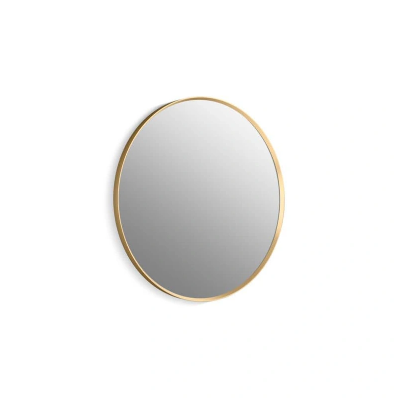 KOHLER 32" Round Vanity Mirror in Brushed Gold Elevate your bathroom aesthetics with the KOHLER Essential 32" Round Wall-Mount Vanity Mirror. Featuring a modern brushed gold finish, this mirror offers both durability and timeless elegance, seamlessly blend