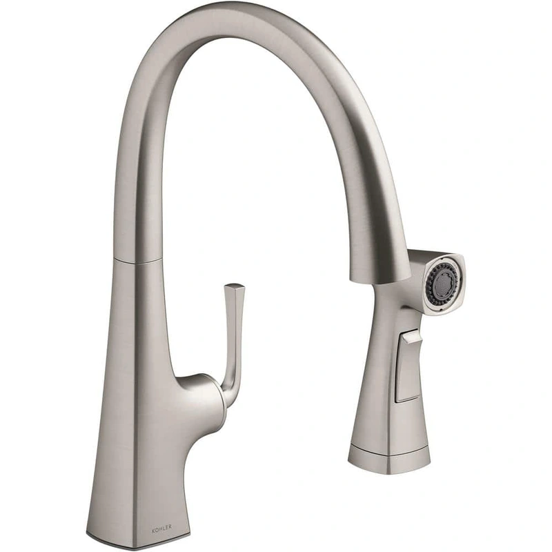The KOHLER Graze Kitchen Faucet, crafted from premium metal, boasts a bold and eye-catching design inspired by industrial Americana. With its robust square base and remarkable features like a high-arch swing spout and a matching side spray, it offers exceptional functionality and style to any kitchen. The vibrant stainless finish ensures durability and resistances against corrosion and tarnishing, making it a lasting choice for professionals and home enthusiasts alike.