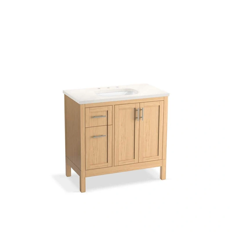 KOHLER Hadron 36.72in Single Sink Vanity - Light Oak with Quartz Top Experience effortless elegance with the KOHLER Hadron 36.72-inch Single Sink Vanity. This freestanding bath vanity in light oak harbor a stunning white quartz top, offering a perfect blen