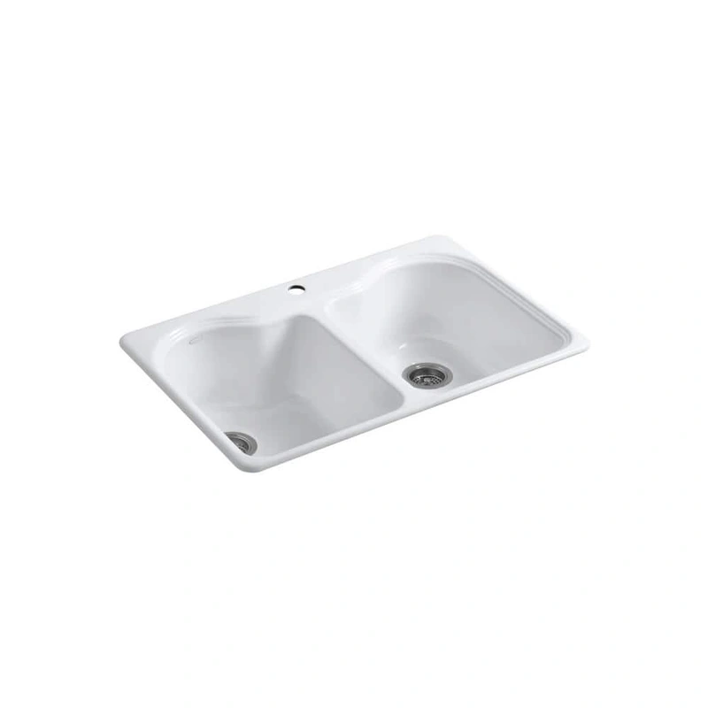 KOHLER Hartland Double Bowl Cast Iron Kitchen Sink The KOHLER Hartland Double Bowl Kitchen Sink features a timeless scalloped design crafted from durable enameled cast iron. Its resilient finish prevents chipping, ensuring long-lasting beauty and functiona