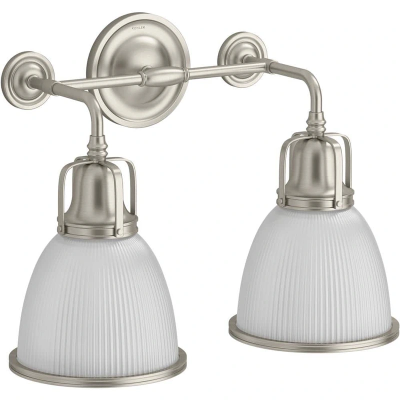 KOHLER Hauksbee 2-Light Brushed Nickel Wall Sconce Illuminate your space with the KOHLER Hauksbee 2-Light Brushed Nickel Wall Sconce, a perfect blend of vintage charm and modern elegance. Featuring a stunning glass shade inspired by vintage holophane glass