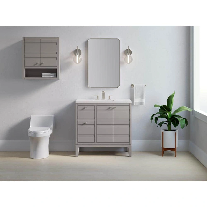 Revamp your bathroom with the KOHLER Helst 36″ Single Sink Vanity in sophisticated Mohair Grey with a sleek White Quartz countertop. Combining modern design and functionality, it’s equipped with soft-close drawers and doors for seamless use, offering ample storage and style for any bathroom.