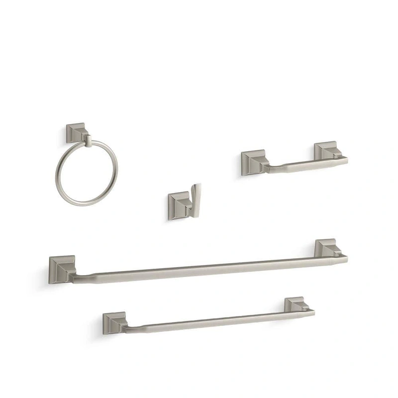 KOHLER Kallan 5-Piece Bathroom Hardware Set Transform your bathroom with the KOHLER Kallan 5-Piece Bathroom Hardware Set in vibrant brushed nickel. This set blends modern and traditional elements, offering a durable, corrosion-resistant finish that complem