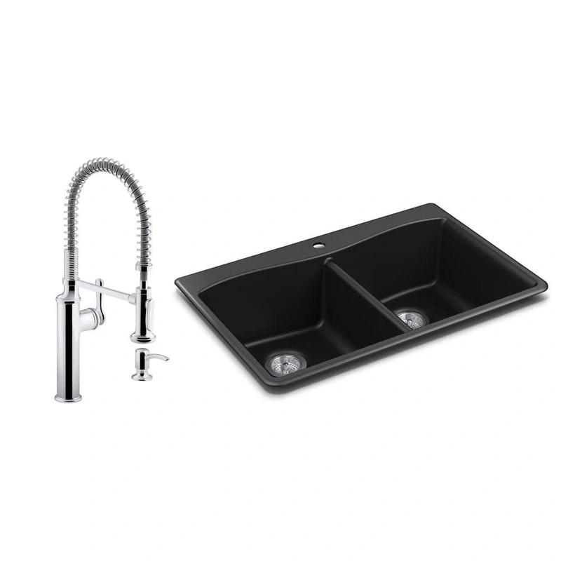 KOHLER Kennon Granite Composite Double Bowl Sink with Faucet The KOHLER Kennon Double Bowl Kitchen Sink, crafted from durable Neoroc granite composite, combines function and style. This sink is designed for high endurance, resisting scratches, stains, and
