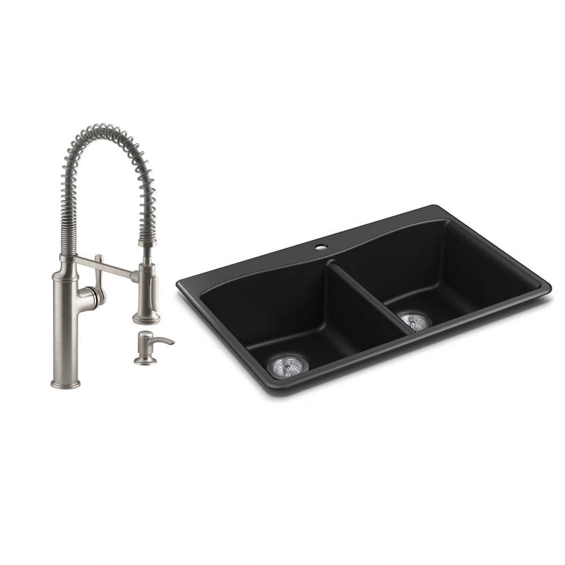 Enhance your kitchen with the KOHLER Kennon Double Bowl Sink, a stunning blend of form and function. Made from durable Neoroc granite composite with a matte finish, this sink offers resistance against scratches, stains, and thermal shock. Complete with a Sous Semi-pro Kitchen Faucet, it promises an efficient kitchen workflow while adding a contemporary touch.
