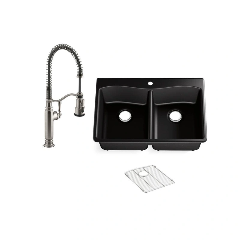 Kennon 33 in. Double Bowl Kitchen Sink with Matte Black Faucet The KOHLER Kennon kitchen sink in elegant matte black offers outstanding durability and style, crafted from composite granite for extreme resilience. Its Neoroc material ensures resistance to s