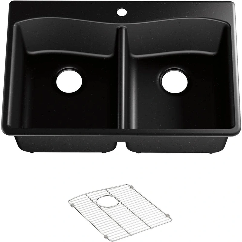 KOHLER Kennon Neoroc Granite Dual Bowl Kitchen Sink Transform your kitchen with the KOHLER Kennon Dual Mount Kitchen Sink. Crafted from durable Neoroc granite composite, this 33-inch matte black sink boasts a modern design with wave-like curves that resist