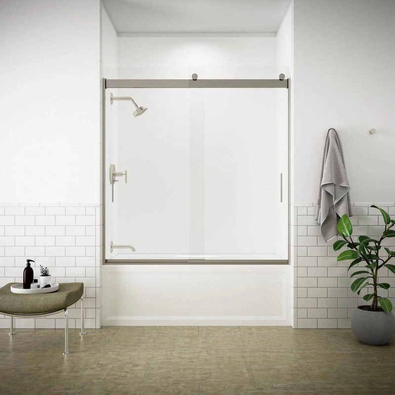KOHLER Levity Semi-Frameless Sliding Tub Door Elevate your bath experience with the KOHLER Levity Semi-Frameless Sliding Tub Door. Designed for smooth, ultra-quiet operation, this nickel-finished door features a contemporary minimalist style with vertical