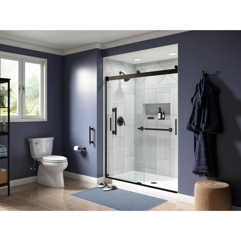 Upgrade your bathroom with the KOHLER Levity Frameless Sliding Shower Door, featuring a smooth, quiet-sliding mechanism and crystal clear tempered glass for a sleek, modern look. The anodized dark bronze finish and vertical blade handles add a touch of elegance, ensuring this shower door is as stylish as it is functional.
