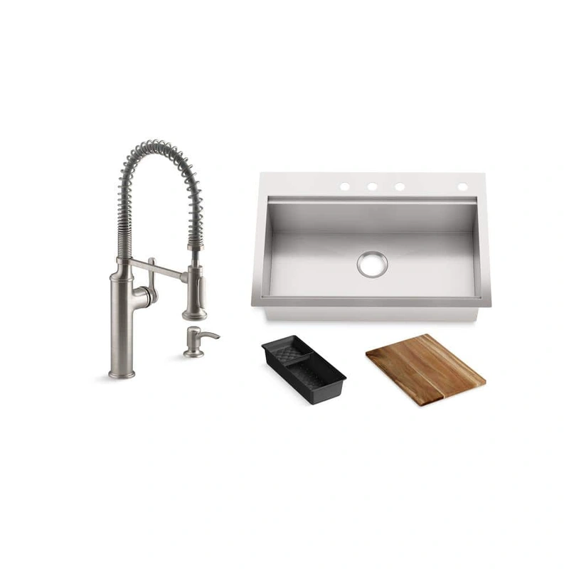 KOHLER Lyric Stainless Steel Workstation Sink with Semi Pro Faucet Transform your culinary space with the KOHLER Lyric 33-inch Stainless Steel Workstation Sink, featuring a versatile Sous Semi-Pro Faucet. Crafted from durable 18-gauge stainless steel, this