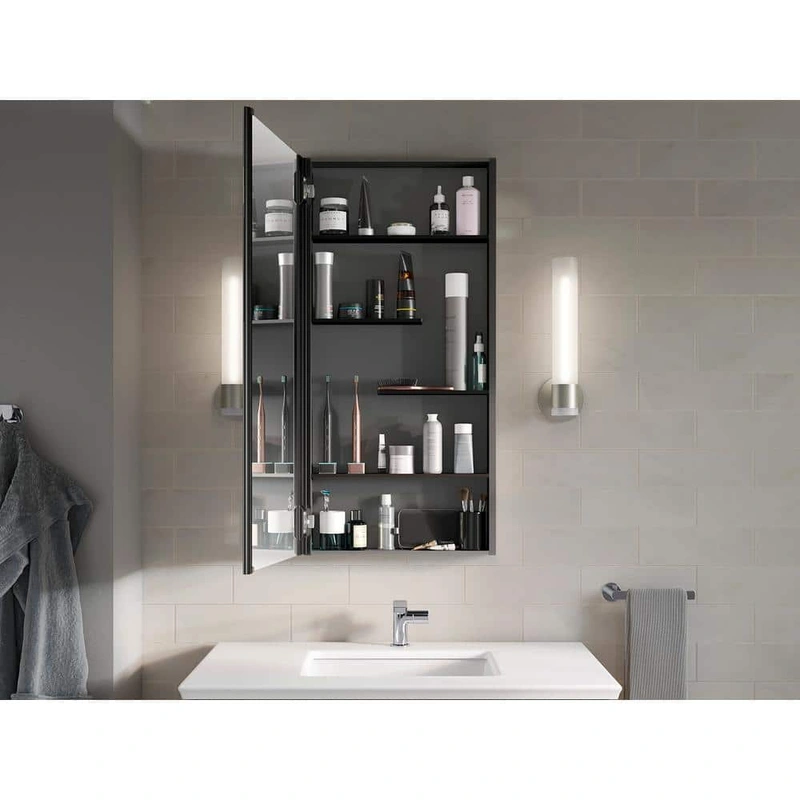 KOHLER Maxstow 20x40 Medicine Cabinet Enhance your bathroom with the sleek and efficient KOHLER Maxstow Medicine Cabinet. Designed with a dark anodized aluminum finish, its innovative staggered shelving and low-profile design provide optimal storage withou