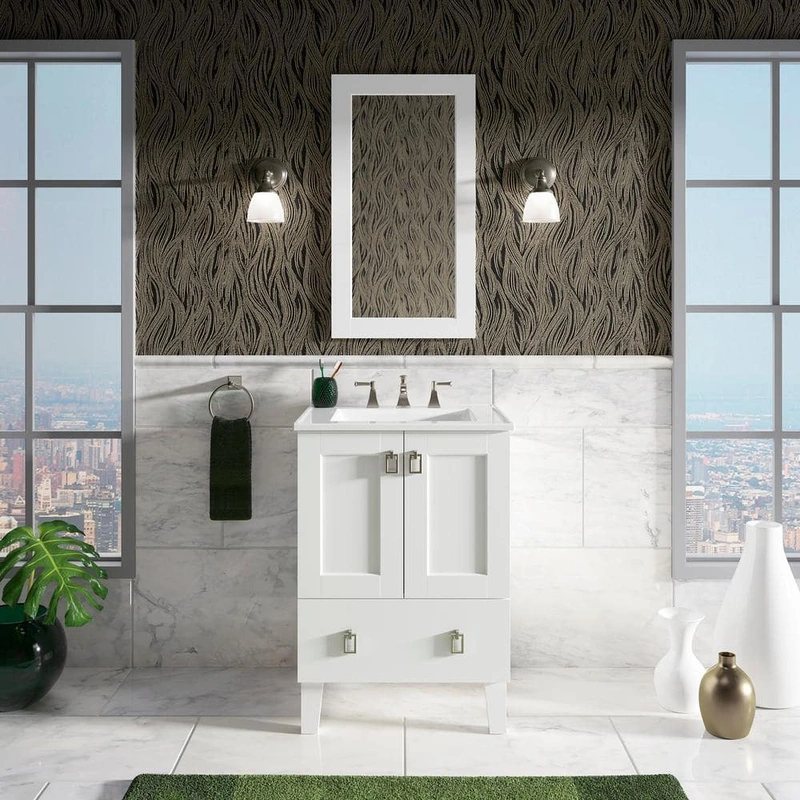 KOHLER Poplin 24" Linen White Bathroom Vanity Cabinet The KOHLER Poplin Vanity Cabinet, crafted from solid wood in a chic Linen White finish, offers the perfect blend of elegance and function. Inspired by Craftsman and Shaker designs, this vanity features