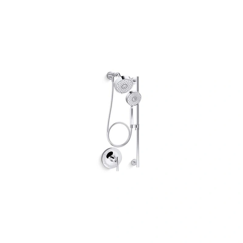 Elevate your shower experience with the KOHLER Purist Dual Shower Heads, featuring three luxurious spray patterns for optimal relaxation. With its stunning polished chrome finish, this dual-function wall mount system includes a slide bar and hose for full flexibility, making it perfect for both master and secondary baths.