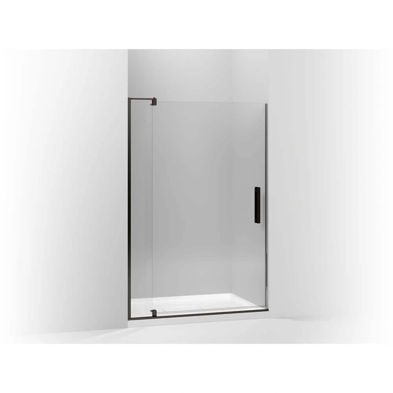 KOHLER 48x74 Pivot Frameless Shower Door Upgrade your bathroom with the KOHLER Revel Frameless Shower Door, featuring a sleek anodized dark bronze finish and crystal clear glass. Designed with an elegant pivoting system, this shower door boasts a minimalis