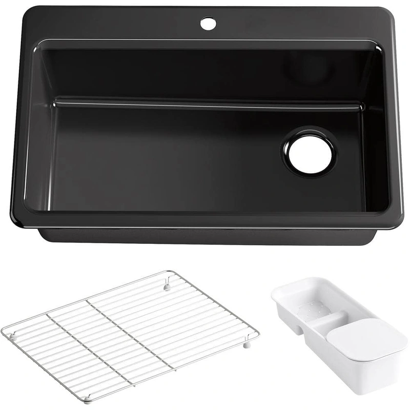 Riverby Black Cast Iron Single Bowl Sink Kit The KOHLER Riverby Drop-In Cast Iron Kitchen Sink offers a blend of elegance and functionality, featuring a spacious single bowl ideal for handling large cookware. Its enameled cast iron material resists chips a