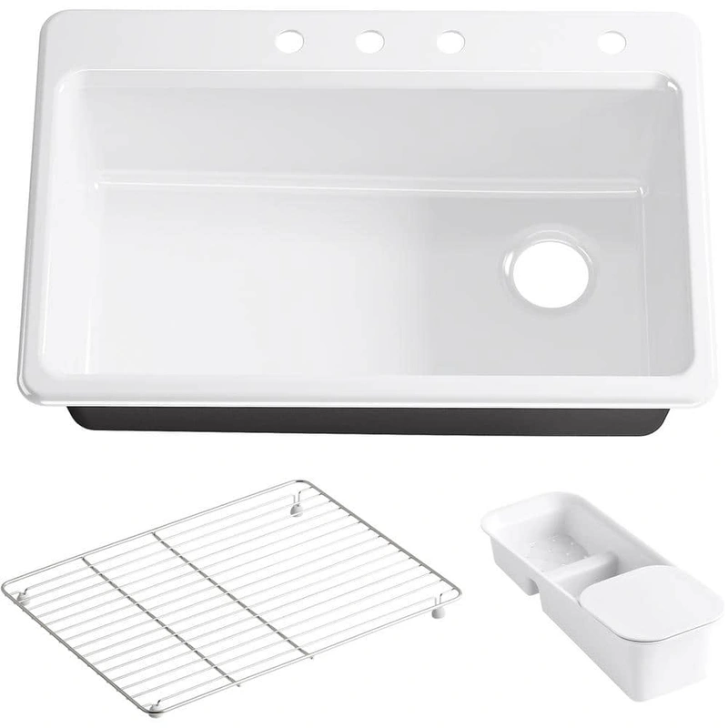 KOHLER Riverby 33" White Cast Iron Kitchen Sink Kit The KOHLER Riverby 33" Workstation Kitchen Sink combines timeless beauty and durability with modern functionality. This drop-in cast iron sink resists scratches and stains, offering long-lasting performan
