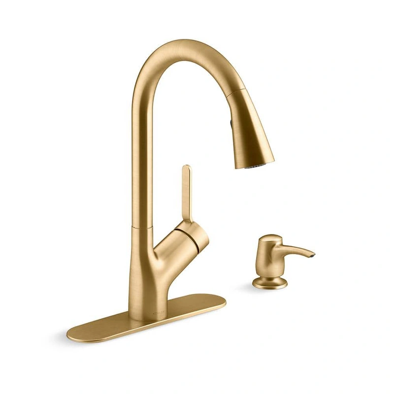 KOHLER Setra Pull-Down Kitchen Faucet Elevate your kitchen's functionality and aesthetic with the KOHLER Setra Pull-Down Kitchen Faucet in Vibrant Brushed Moderne Brass. Featuring advanced ProMotion technology for easy maneuverability and a sleek, modern d