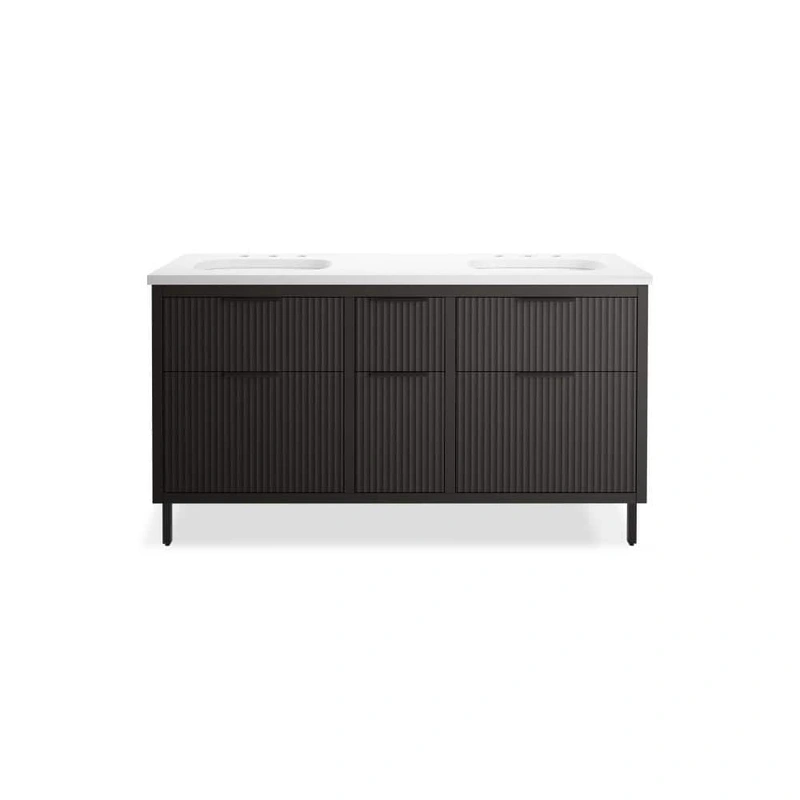 KOHLER Spacity 60'' Double Sink Wall-Hung Vanity The KOHLER Spacity 60'' Double Sink Vanity is a modern wall-hung unit, designed to optimize space while offering a striking dark steel finish and a sleek white quartz countertop. Featuring fluted exterior dr