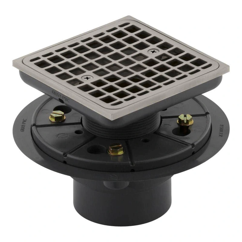KOHLER Square Tile-in Shower Drain Upgrade your shower with the KOHLER Square Tile-in Shower Drain, featuring a sleek, brushed nickel finish that resists corrosion and tarnishing. This robust drain is crafted from brass and PVC, ensuring enduring durabilit