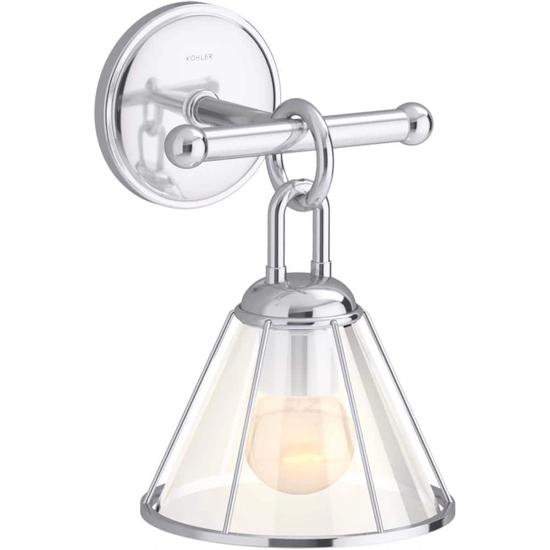 KOHLER Terret Polished Chrome Wall Sconce Elevate any space with the KOHLER Terret 1-Light Polished Chrome Wall Sconce, drawing on classic equestrian aesthetics for a modern touch. This fixture combines elegant glass shapes and sturdy metal finishes, suita