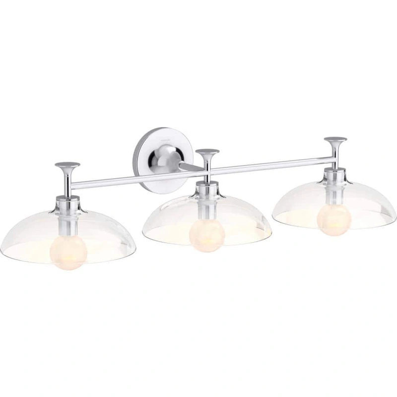 KOHLER Tone 3-Light Polished Chrome Vanity Light Illuminate your bathroom with the sophisticated KOHLER Tone 3-Light Vanity Light in polished chrome. Engineered with domed glass shades and sleek metal supports, it embodies a modern aesthetic perfect for an