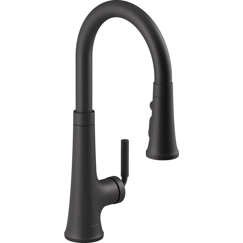 KOHLER Tone Matte Black Pull-Down Kitchen Faucet Elevate your kitchen's functionality with the KOHLER Tone Matte Black Pull-Down Kitchen Faucet. Blending mid-century modern aesthetics with cutting-edge technology, this faucet offers a sleek look and except