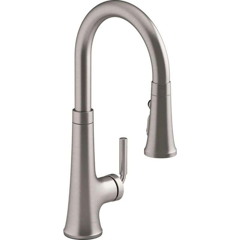 Elevate your kitchen aesthetics and functionality with the KOHLER Tone Single Handle Pull-Down Sprayer Faucet. Featuring a sleek mid-century modern design and innovative technologies like Boost and Sweep spray, this faucet offers a harmonious blend of style and performance. Its Vibrant Stainless finish and robust materials ensure it complements any kitchen while delivering durable performance.